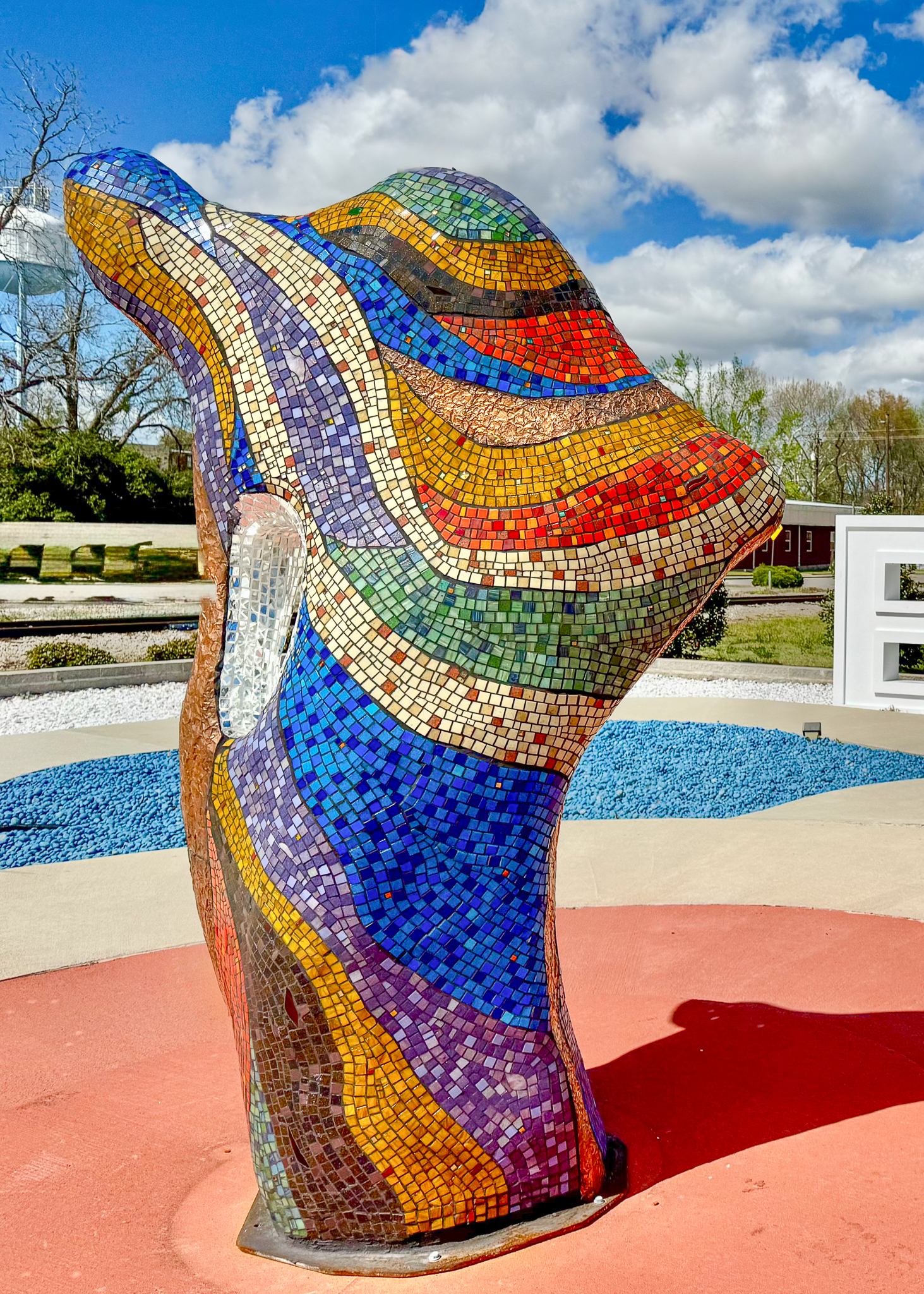 An aerial view of the art park reveals an expansive flower design stretching over the full length of the lot, with sculptures located on each of the three outspreading “petals” and one sculpture situated in the middle of the flower “bloom.” The park features stained concrete sculpture pads and a sidewalk installed by the City of Statesboro’s Public Works Department as well as recycled rock aggregate sourced from GreenRock, a local recycling company that produces the rocks from 100% recycled material collected in Bulloch County. At the far end of the park, six-foot-tall white letters spelling “BORO” cast a shadow over the flower design.